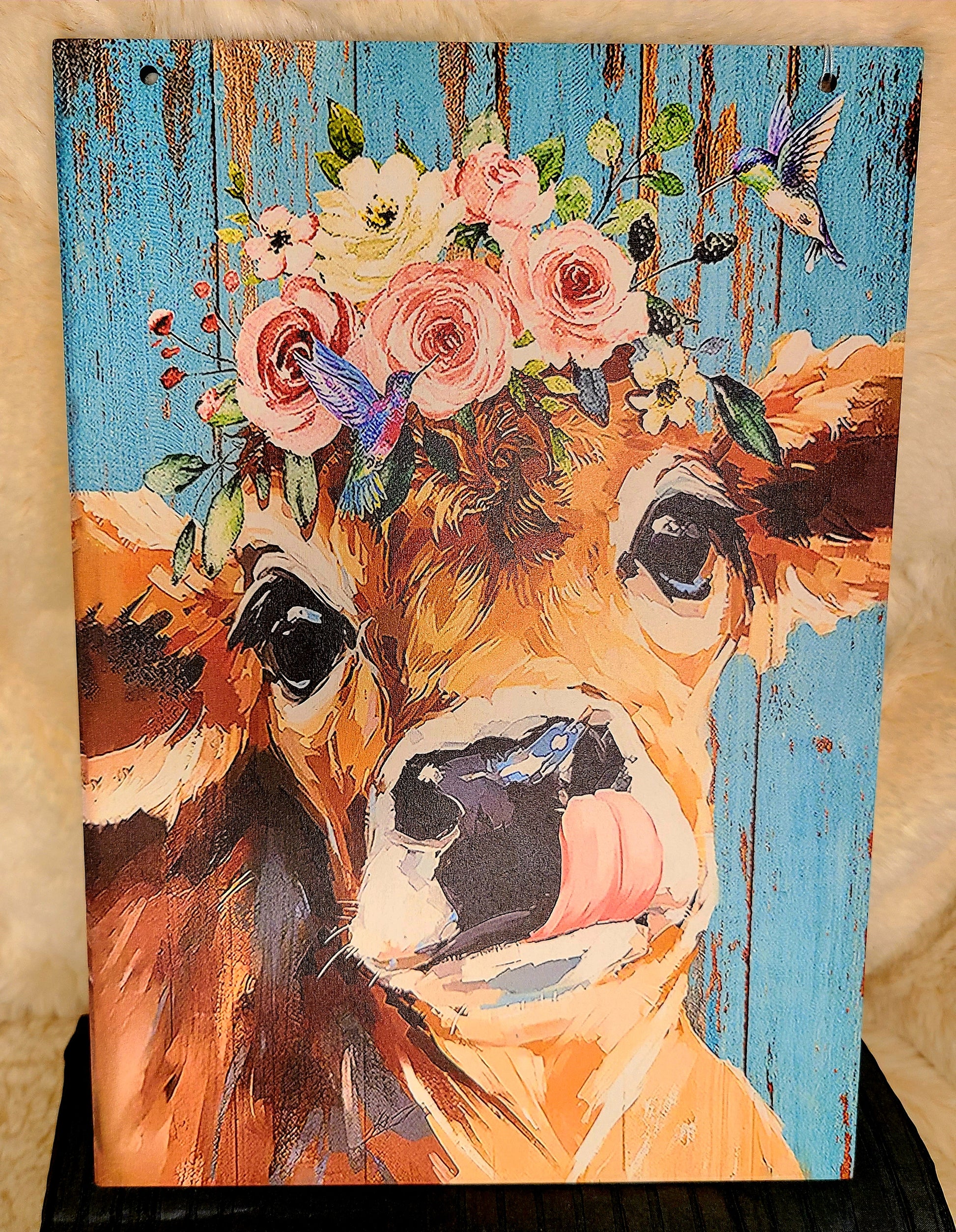 Cow, Flowers and Hummingbird Handcrafted Wood Plaque