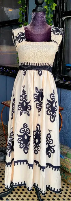 Ivory and Black Sleeveless Smocked Maxi Dress